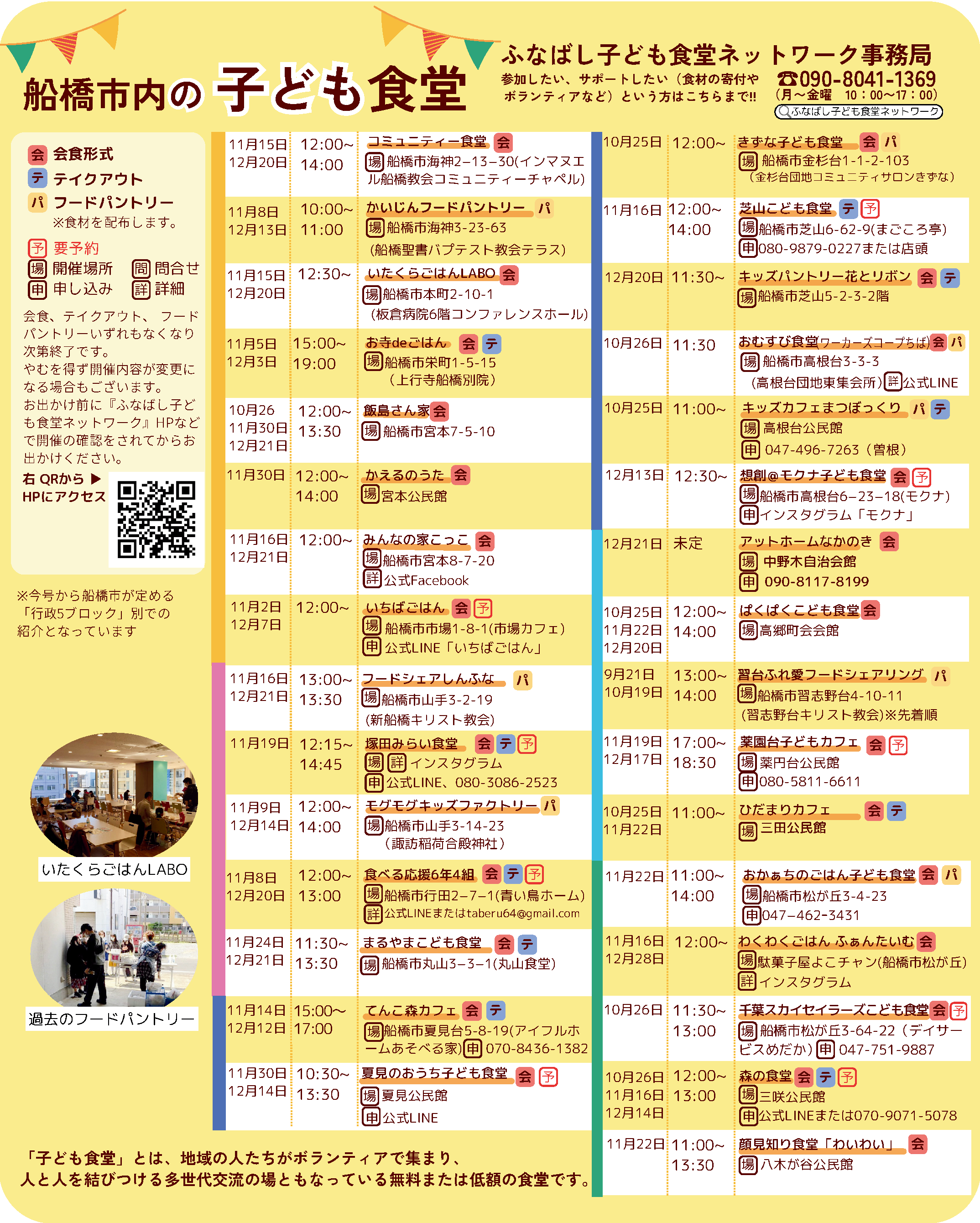 ひと言:船橋市内で最初に始まった子ども食堂です。困ったときに「助けて!」と言えるのが本当の自立です。「助けて」と言い合える地域のつながり作りを進めるため、毎月1回ゾロ目の日に子ども食堂を開催しています。前日に整理券を配布していますので、instagramアカウント(@kitanarakodomo)の投稿にて詳細を確認の上、ご参加ください。みなさんのお越しをお待ちしています!